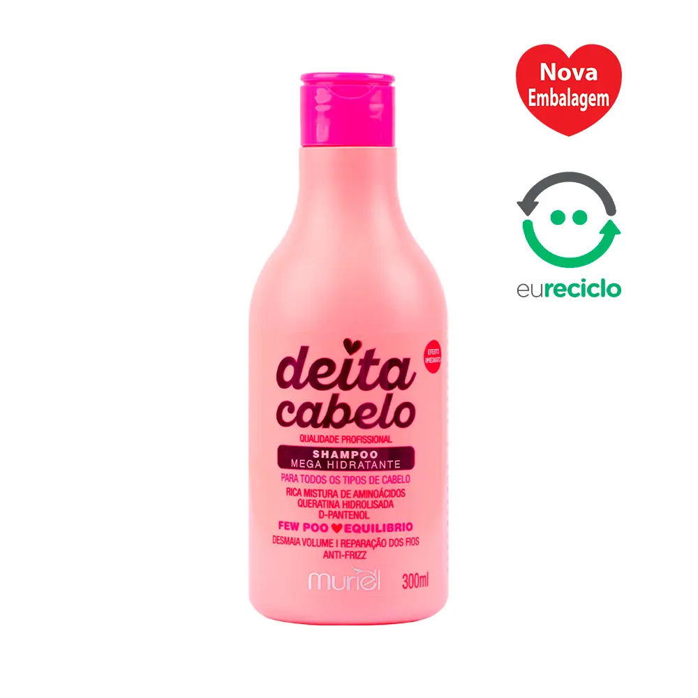 A linha Deita Cabelo, composta por shampoo, condicionador, máscara e finalizador, utiliza a tecnologia FEW POO, com baixa detergência, para limpar, hidratar, nutrir e proteger profundamente os fios. Enriquecida com Queratina Hidrolisada, aminoácidos e D-Pantenol, essa linha fortalece os cabelos, elimina o frizz e reduz os danos causados pela química e pelo uso do secador e chapinha.